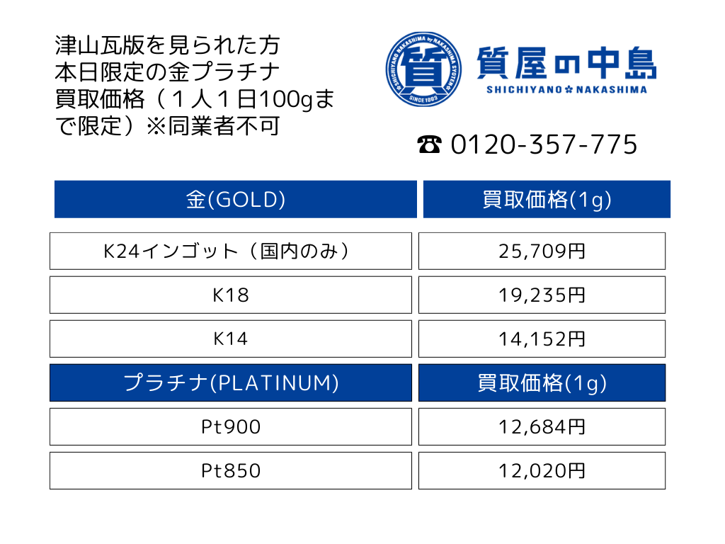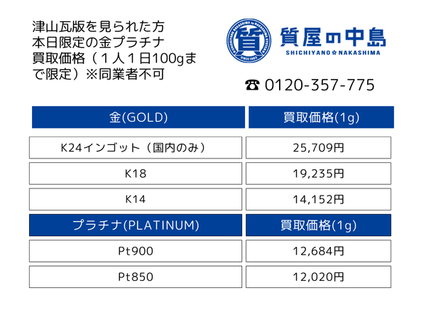 金・プラチナ買取 金貨買取 津山瓦版を見た方の限定価格掲載中! 津山市で金券・腕時計・ブランド品などの買取・質預かりなら質屋の中島へお任せください!2026年1月17日限定価格 M